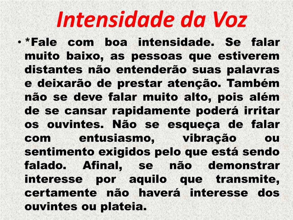 Intensidade da Voz • *Fale com boa intensidade. Se falar muito baixo, as pessoas que estiverem distantes não entenderão suas palavras e deixarão de prestar atenção. Também não se deve falar muito alto, pois além de se cansar rapidamente poderá irritar os ouvintes. Não se esqueça de falar com entusiasmo, vibração ou sentimento exigidos pelo que está sendo falado. Afinal, se não demonstrar interesse por aquilo que transmite, certamente não haverá interesse dos ouvintes ou plateia.