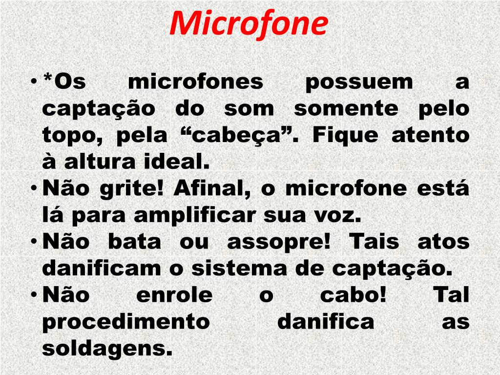 Microfone • *Os microfones possuem a captação do som somente pelo topo, pela “cabeça”. Fique atento à altura ideal. • Não grite! Afinal, o microfone está lá para amplificar sua voz. • Não bata ou assopre! Tais atos danificam o sistema de captação. • Não enrole o cabo! Tal procedimento danifica as soldagens.