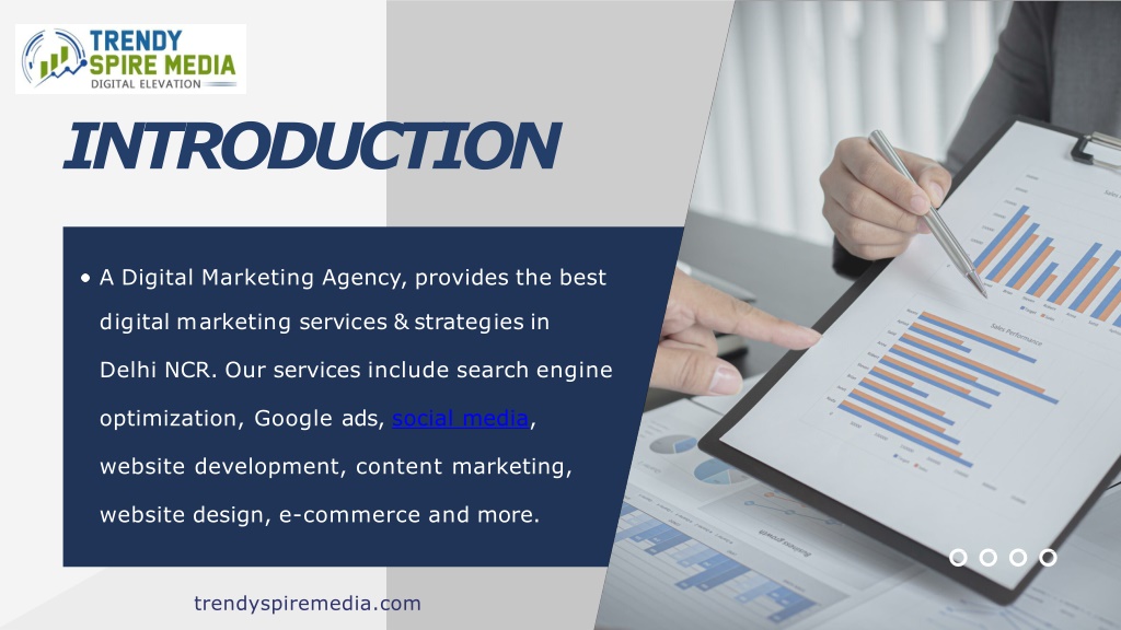 INTRODUCTION ADigitalMarketingAgency,providesthebest digitalmarketingservices&strategiesin DelhiNCR.Ourservicesincludesearchengine optimization, Google ads, social media, website development, content marketing, websitedesign,e-commerceandmore. trendyspiremedia.com