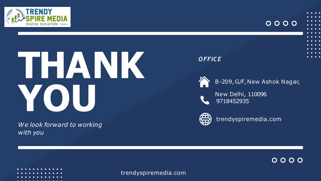 THANK YOU Welookforwardtoworking withyou OFFICE B-209,G/F,NewAshokNagar, NewDelhi,110096 9718452935 trendyspiremedia.com trendyspiremedia.com