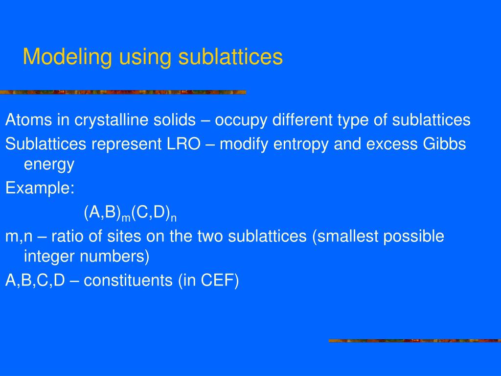Modeling using sublattices Atoms in crystalline solids – occupy different type of sublattices Sublattices represent LRO – modify entropy and excess Gibbs energy Example: (A,B)m(C,D)n m,n – ratio of sites on the two sublattices (smallest possible integer numbers) A,B,C,D – constituents (in CEF)