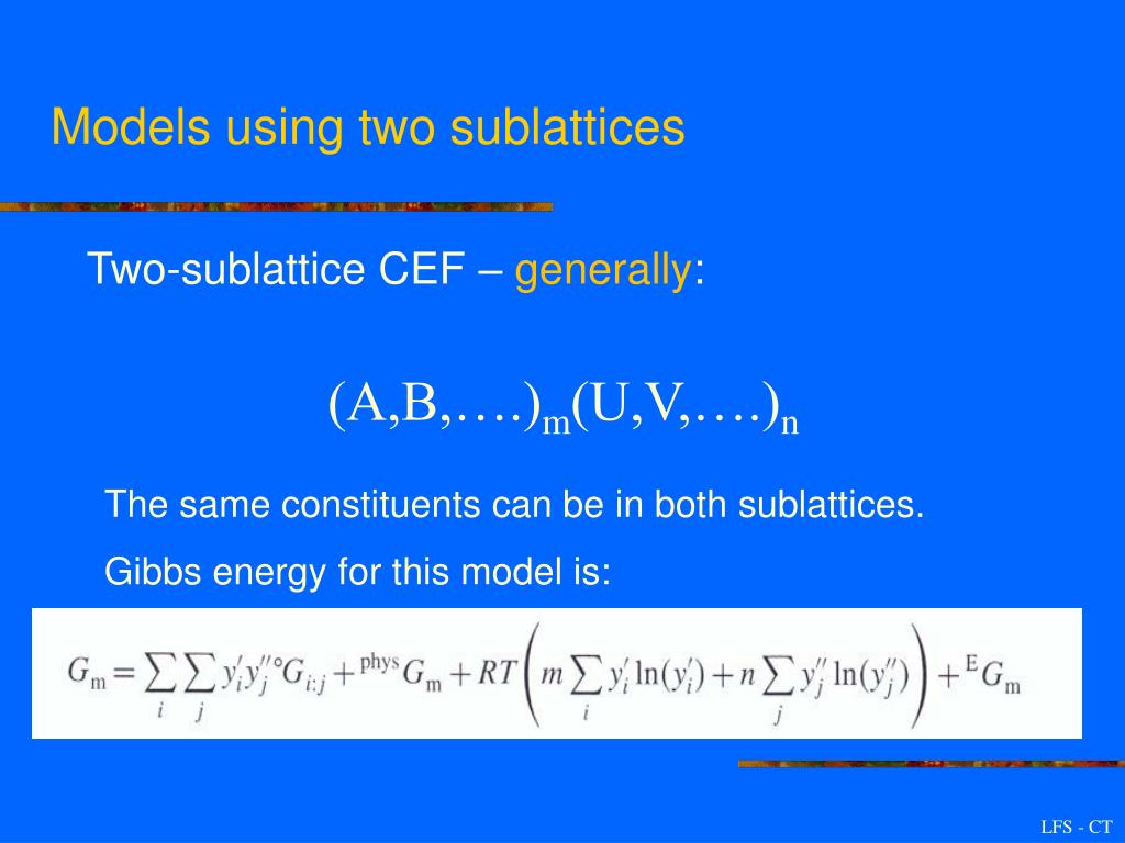 Models using two sublattices Two-sublattice CEF – generally: (A,B,….)m(U,V,….)n Thesameconstituentscanbe in bothsublattices. Gibbsenergyforthis model is: LFS - CT