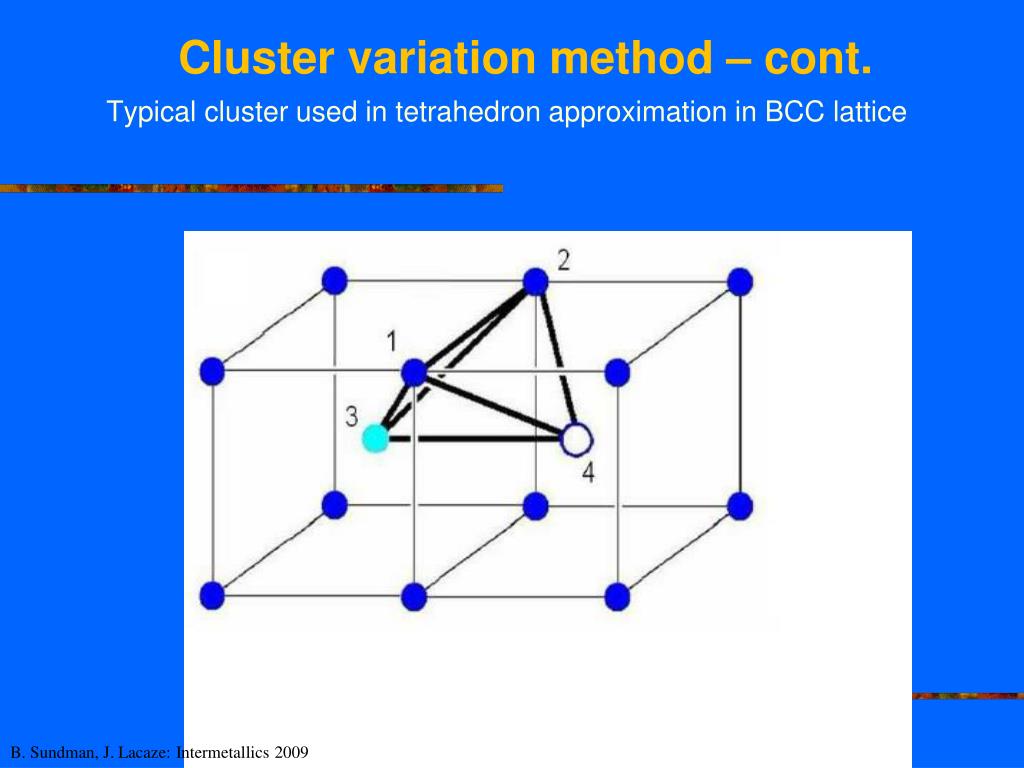 Cluster variation method – cont. Typical cluster used in tetrahedron approximation in BCC lattice B. Sundman, J. Lacaze: Intermetallics 2009