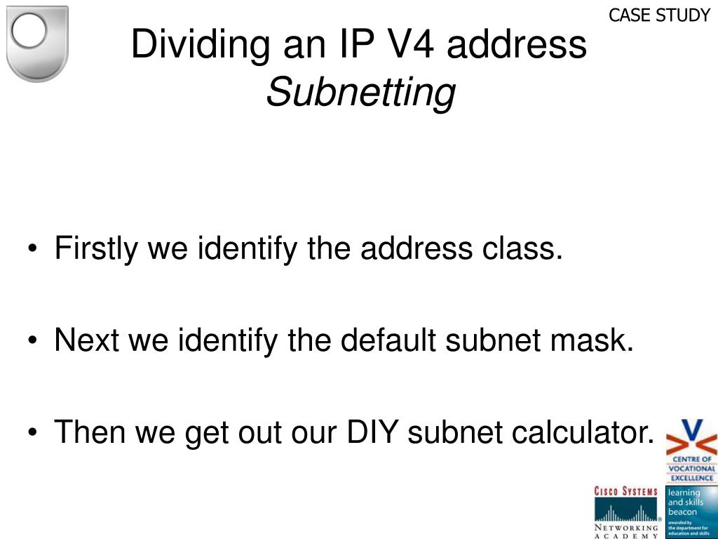 CASE STUDY Dividing an IP V4 addressSubnetting • Firstly we identify the address class. • Next we identify the default subnet mask. • Then we get out our DIY subnet calculator.