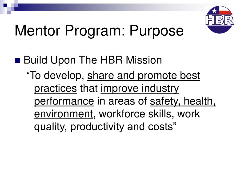 Mentor Program: Purpose • Build Upon The HBR Mission “To develop, share and promote best practices that improve industry performance in areas of safety, health, environment, workforce skills, work quality, productivity and costs”