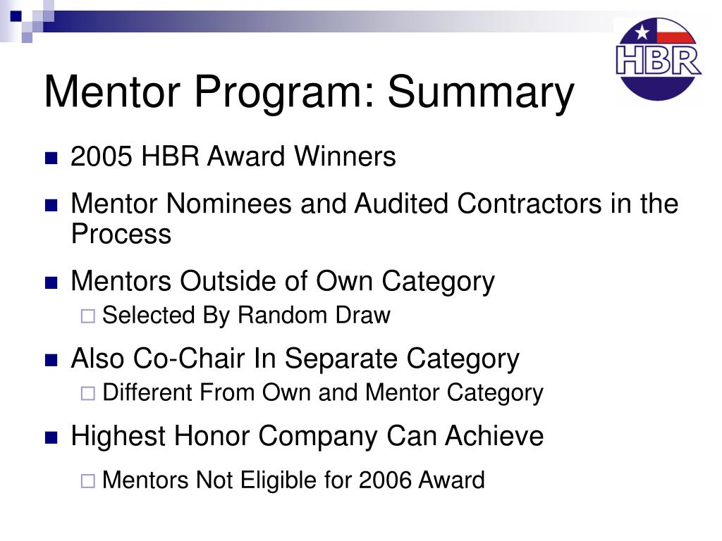 Mentor Program: Summary • 2005 HBR Award Winners • Mentor Nominees and Audited Contractors in the Process • Mentors Outside of Own Category • Selected By Random Draw • Also Co-Chair In Separate Category • Different From Own and Mentor Category • Highest Honor Company Can Achieve • Mentors Not Eligible for 2006 Award