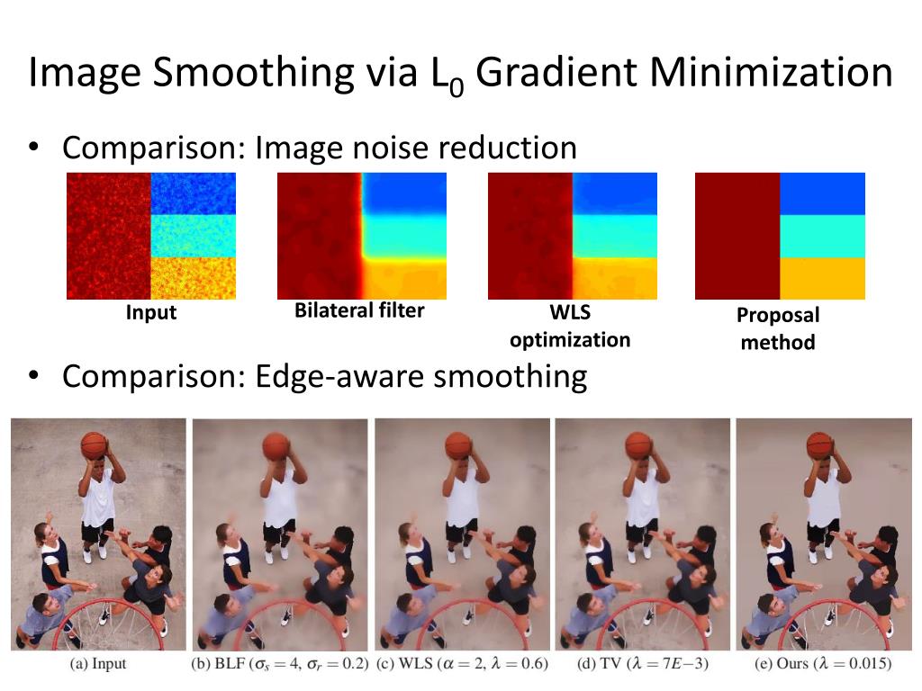 Image Smoothing via L0 Gradient Minimization • Comparison: Image noise reduction • Comparison: Edge-aware smoothing Bilateral filter Input WLS optimization Proposal method
