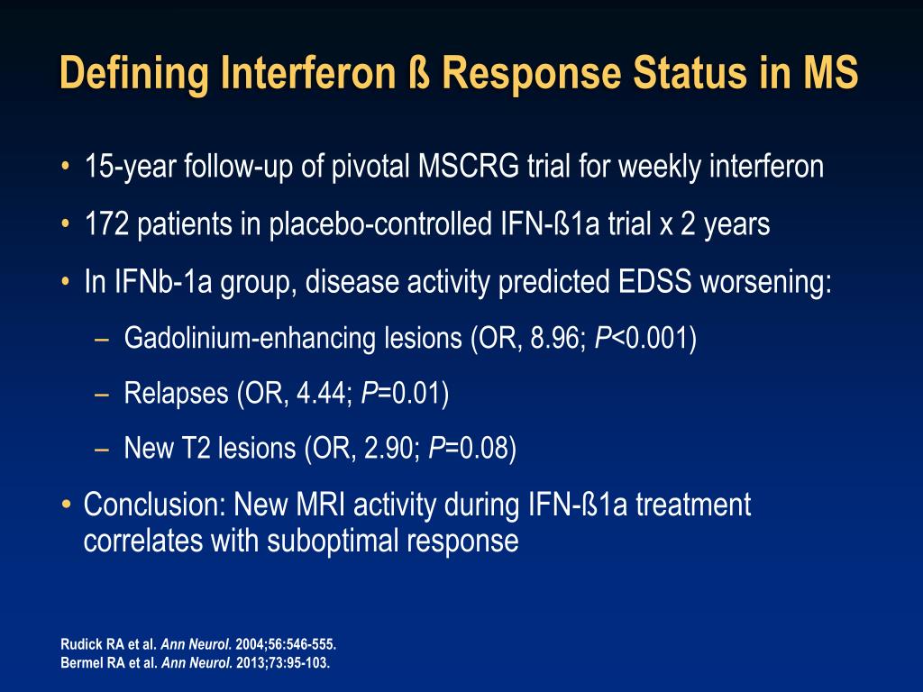 Defining Interferon ß Response Status in MS • 15-year follow-up of pivotal MSCRG trial for weekly interferon • 172 patients in placebo-controlled IFN-ß1a trial x 2 years • In IFNb-1a group, disease activity predicted EDSS worsening: • Gadolinium-enhancing lesions (OR, 8.96; P<0.001) • Relapses (OR, 4.44; P=0.01) • New T2 lesions (OR, 2.90; P=0.08) • Conclusion: New MRI activity during IFN-ß1a treatment correlates with suboptimal response Rudick RA et al. Ann Neurol. 2004;56:546-555. Bermel RA et al. Ann Neurol. 2013;73:95-103.
