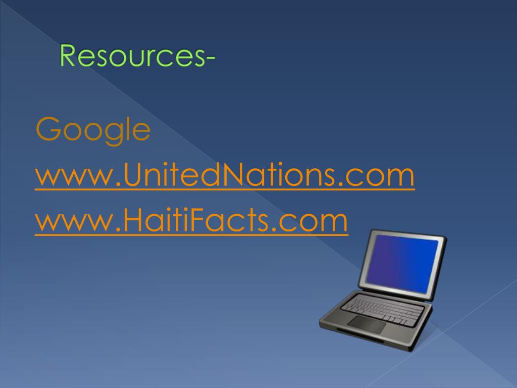 Resources- Google www.UnitedNations.com www.HaitiFacts.com