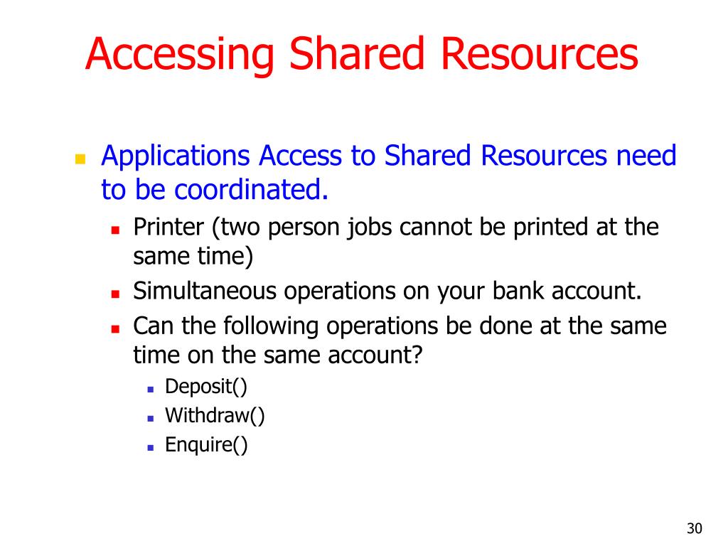 Accessing Shared Resources • Applications Access to Shared Resources need to be coordinated. • Printer (two person jobs cannot be printed at the same time) • Simultaneous operations on your bank account. • Can the following operations be done at the same time on the same account? • Deposit() • Withdraw() • Enquire()