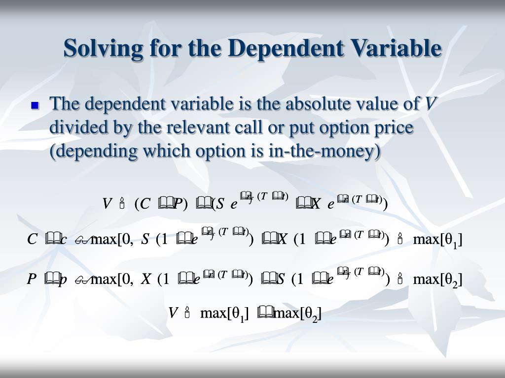 Solving for the Dependent Variable • The dependent variable is the absolute value of V divided by the relevant call or put option price (depending which option is in-the-money)