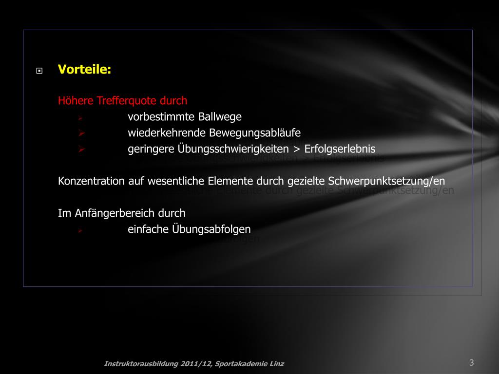 Vorteile: • HöhereTrefferquotedurch • vorbestimmteBallwege • wiederkehrendeBewegungsabläufe • geringereÜbungsschwierigkeiten > Erfolgserlebnis • Konzentration auf wesentlicheElementedurchgezielteSchwerpunktsetzung/en • ImAnfängerbereichdurch • einfacheÜbungsabfolgen 3 Instruktorausbildung 2011/12, Sportakademie Linz