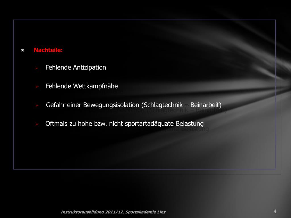 Nachteile: • FehlendeAntizipation • FehlendeWettkampfnähe • GefahreinerBewegungsisolation (Schlagtechnik – Beinarbeit) • Oftmalszuhohebzw. nichtsportartadäquateBelastung 4 Instruktorausbildung 2011/12, Sportakademie Linz