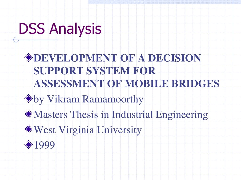 DSS Analysis • DEVELOPMENT OF A DECISION SUPPORT SYSTEM FOR ASSESSMENT OF MOBILE BRIDGES • byVikram Ramamoorthy • Masters Thesis in Industrial Engineering • West Virginia University • 1999