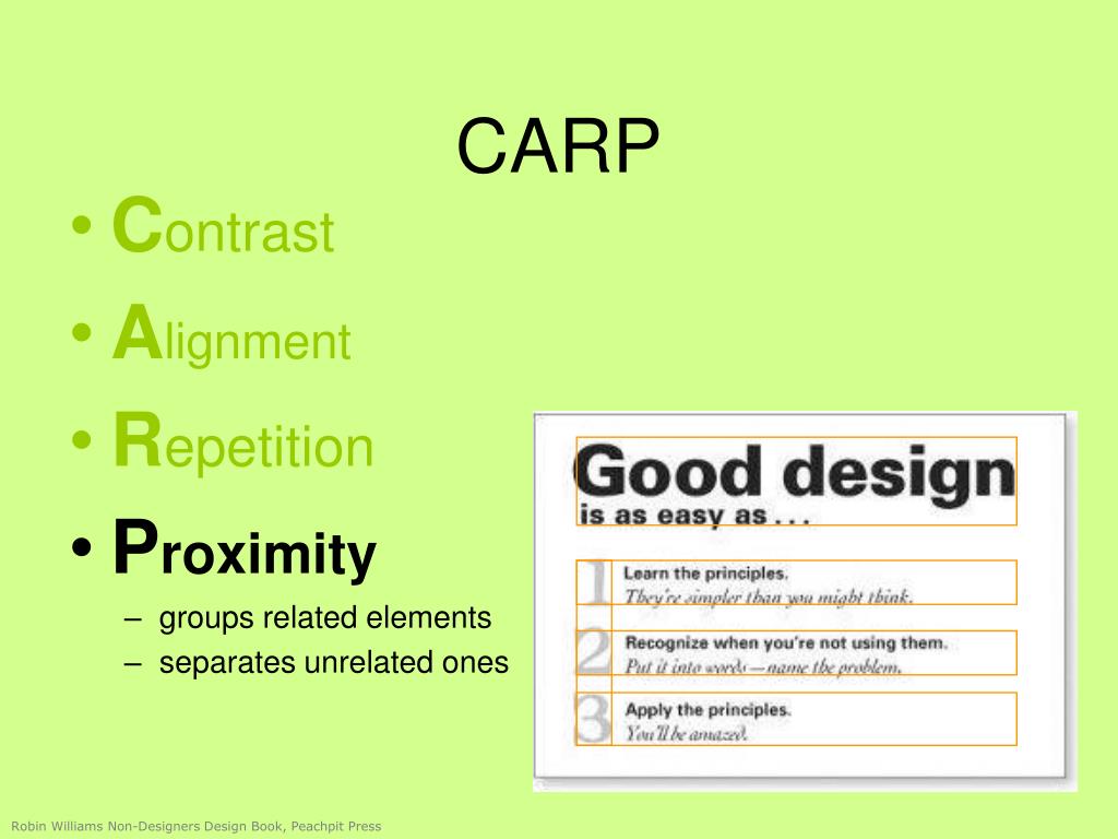 CARP • Contrast • Alignment • Repetition • Proximity • groups related elements • separates unrelated ones Robin Williams Non-Designers Design Book, Peachpit Press