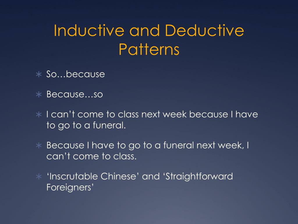 Inductive and Deductive Patterns • So…because • Because…so • I can’t come to class next week because I have to go to a funeral. • Because I have to go to a funeral next week, I can’t come to class. • ‘Inscrutable Chinese’ and ‘Straightforward Foreigners’