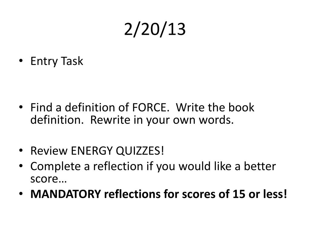 2/20/13 • Entry Task • Find a definition of FORCE. Write the book definition. Rewrite in your own words. • Review ENERGY QUIZZES! • Complete a reflection if you would like a better score… • MANDATORY reflections for scores of 15 or less!
