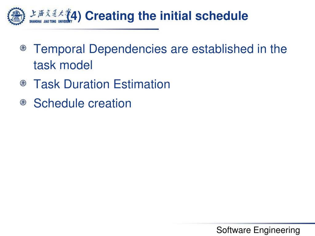 (4) Creating the initial schedule • Temporal Dependencies are established in the task model • Task Duration Estimation • Schedule creation