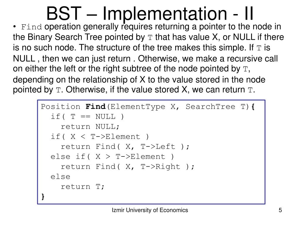 BST – Implementation - II • Findoperation generally requires returning a pointer to the node in the Binary Search Tree pointed byT that has value X, or NULL if there is no such node. The structure of the tree makes this simple. If T is NULL , then we can just return .Otherwise, we make a recursive call on either the left or the rightsubtree of the node pointed byT,depending on the relationship of X to the value stored in the node pointed byT. Otherwise, if the value stored X, we can return T. Position Find(ElementType X, SearchTree T){ if( T == NULL ) return NULL; if( X < T->Element ) return Find( X, T->Left ); else if( X > T->Element ) return Find( X, T->Right ); else return T; } Izmir University of Economics