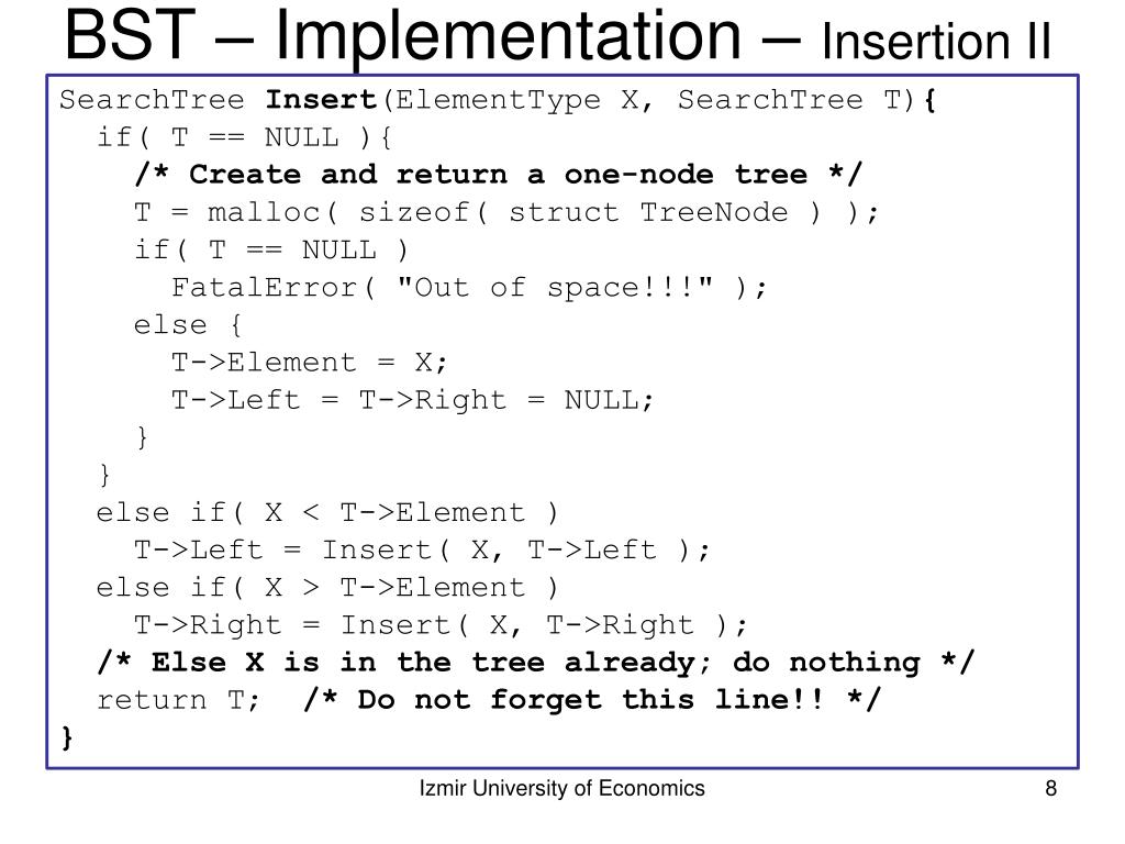 BST – Implementation – Insertion II SearchTree Insert(ElementType X, SearchTree T){ if( T == NULL ){ /* Create and return a one-node tree */ T = malloc( sizeof( structTreeNode ) ); if( T == NULL ) FatalError( "Out of space!!!" ); else { T->Element = X; T->Left = T->Right = NULL; } } else if( X < T->Element ) T->Left = Insert( X, T->Left ); else if( X > T->Element ) T->Right = Insert( X, T->Right ); /* Else X is in the tree already; do nothing */ return T; /* Do not forget this line!! */ } Izmir University of Economics