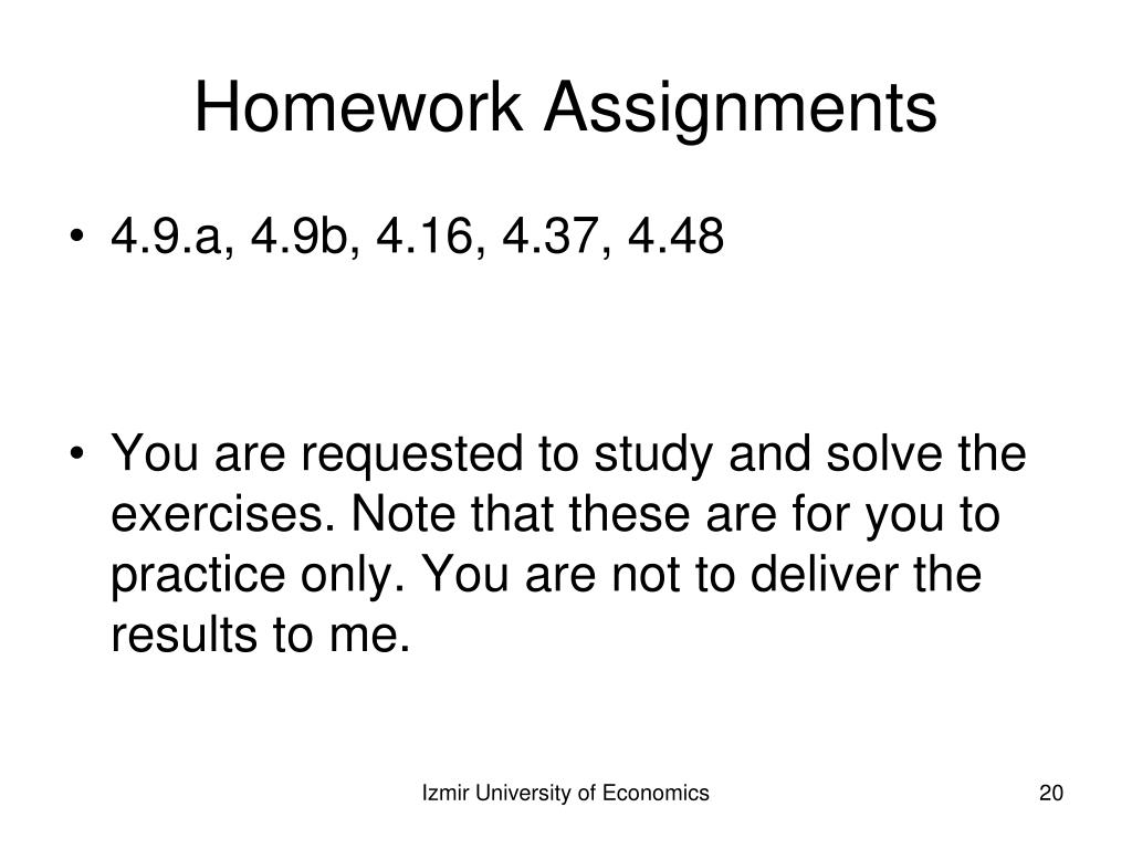 Homework Assignments • 4.9.a, 4.9b, 4.16, 4.37, 4.48 • You are requested to study and solve the exercises. Note that these are for you to practice only. You are not to deliver the results to me. Izmir University of Economics