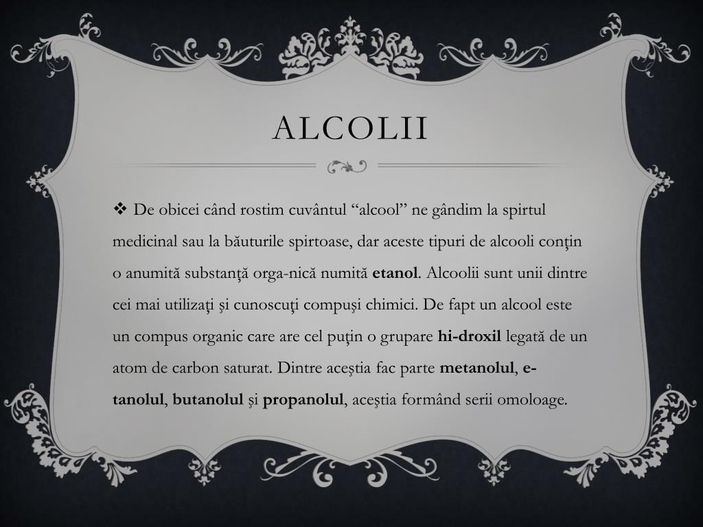 Alcolii • De obicei când rostim cuvântul “alcool” ne gândim la spirtul medicinal sau la băuturile spirtoase, dar aceste tipuri de alcooli conţin o anumită substanţă orga-nică numită etanol. Alcoolii sunt unii dintre cei mai utilizaţi şi cunoscuţi compuşi chimici. De fapt un alcool este un compus organic care are cel puţin o grupare hi-droxil legată de un atom de carbon saturat. Dintre aceştia fac parte metanolul, e-tanolul, butanolul şi propanolul, aceştia formând serii omoloage.
