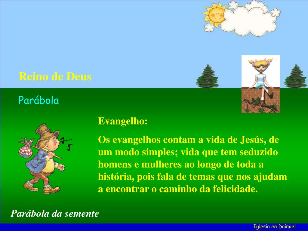 As parábolas do Reino de Deus são: O semeador, a cizânia, O CRESCIMENTO DA SEMENTE, o grão de mostarda, o fermento, o tesouro escondido, a pérola preciosa, a rede de pescar, o dono que cuida do novo e do velho. Reino de Deus Evangelho Parábola: É uma história simples, que todo o mundo pode entender. Esta parábola baseia-se em algo da natureza, o crecimento da semente. Jesús devia ser muito inteligente para propor estes exemplos concretos. Parábola da semente Iglesia en Daimiel