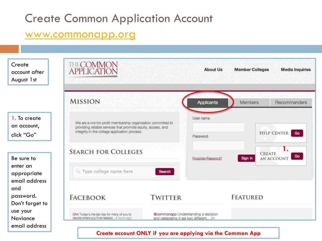 Create Common Application Accountwww.commonapp.org Create account after August 1st 1. Tocreate an account, click “Go” 1. Be sure to enter an appropriate email address and password. Don’t forget to use your Navianceemail address Create account ONLY if you are applying via the Common App