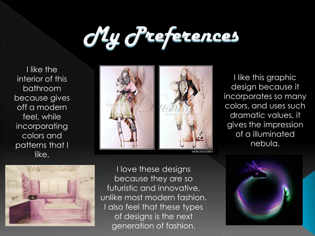 My Preferences I like the interior of this bathroom because gives off a modern feel, while incorporating colors and patterns that I like. I like this graphic design because it incorporates so many colors, and uses such dramatic values, it gives the impression of a illuminated nebula. I love these designs because they are so futuristic and innovative, unlike most modern fashion. I also feel that these types of designs is the next generation of fashion.