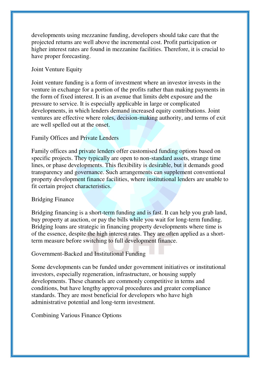 Most successful projects follow more than one option at various stages. Bridging finance can be substituted by senior debt, or mezzanine financing can be layered on a senior loan. Funding property developments is an effective strategy that can be achieved through sequencing property development finance options rather than having a single solution. To Sum Up Each type of development funding helps in its own way. If developers understand the perfect timing of utilizing each funding source, they can lower risks, maintain money flow, and complete the project successfully. Source link: https://tuhfproperty.substack.com/p/different-development- finance-options TUHF Group Contact us: 0105959000 Address: 12th Floor, West Wing, Libridge Building 25 Ameshoff Street Braamfontein, Gauteng 2001 South Africa Email: info@tuhf.co.za Website: https://www.tuhf.co.za/