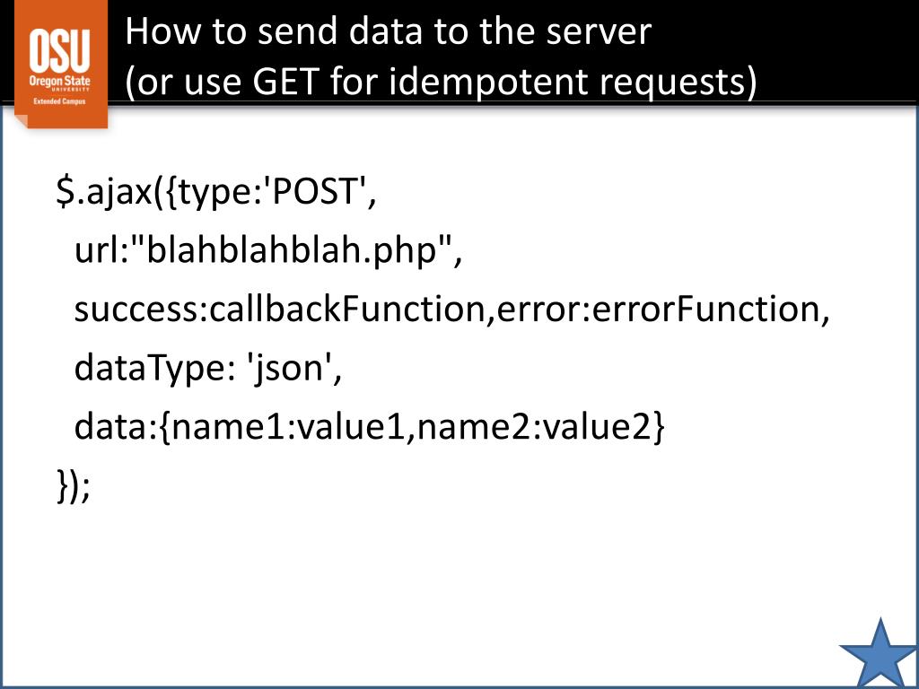 How to send data to the server(or use GET for idempotent requests) $.ajax({type:'POST', url:"blahblahblah.php", success:callbackFunction,error:errorFunction, dataType: 'json', data:{name1:value1,name2:value2} });