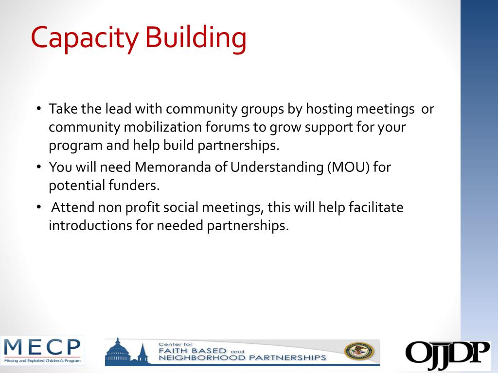 Capacity Building • Take the lead with community groups by hosting meetings or community mobilization forums to grow support for your program and help build partnerships. • You will need Memoranda of Understanding (MOU) for potential funders. • Attend non profit social meetings, this will help facilitate introductions for needed partnerships.