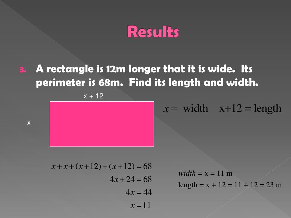 Results • A rectangle is 12m longer that it is wide. Its perimeter is 68m. Find its length and width. x + 12 x