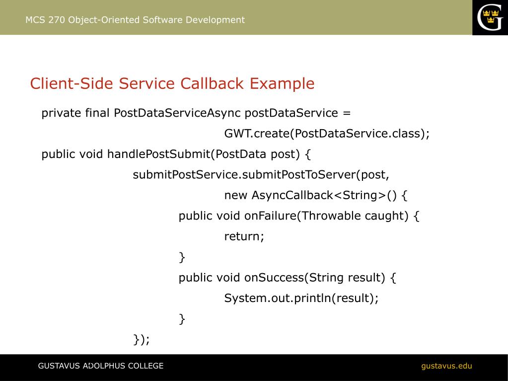 MCS 270 Object-Oriented Software Development Client-Side Service Callback Example private final PostDataServiceAsync postDataService = GWT.create(PostDataService.class); public void handlePostSubmit(PostData post) { submitPostService.submitPostToServer(post, new AsyncCallback<String>() { public void onFailure(Throwable caught) { return; } public void onSuccess(String result) { System.out.println(result); } }); }
