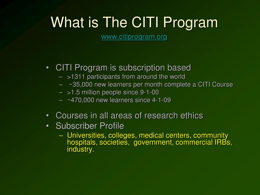 What is The CITI Program www.citiprogram.org • CITI Program is subscription based • >1311 participants from around the world • ~35,000 new learners per month complete a CITI Course • >1.5 million people since 9-1-00 • ~470,000 new learners since 4-1-09 • Courses in all areas of research ethics • Subscriber Profile • Universities, colleges, medical centers, community hospitals, societies, government, commercial IRBs, industry.