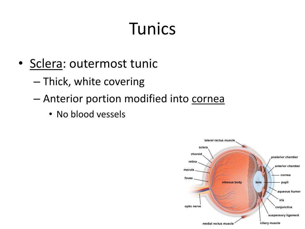 Tunics • Sclera: outermost tunic • Thick, white covering • Anterior portion modified into cornea • No blood vessels