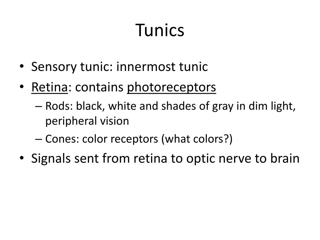 Tunics • Sensory tunic: innermost tunic • Retina: contains photoreceptors • Rods: black, white and shades of gray in dim light, peripheral vision • Cones: color receptors (what colors?) • Signals sent from retina to optic nerve to brain