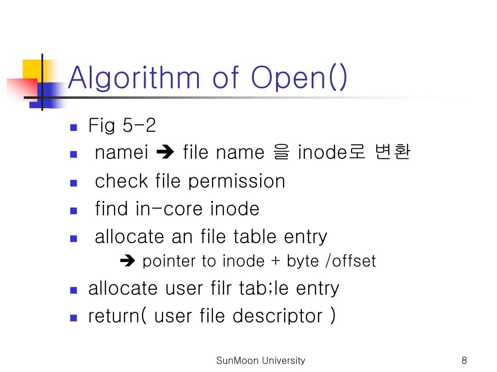 Algorithm of Open() • Fig 5-2 • namei file name 을 inode로 변환 • check file permission • find in-core inode • allocate an file table entry pointer to inode + byte /offset • allocate user filr tab;le entry • return( user file descriptor ) SunMoon University