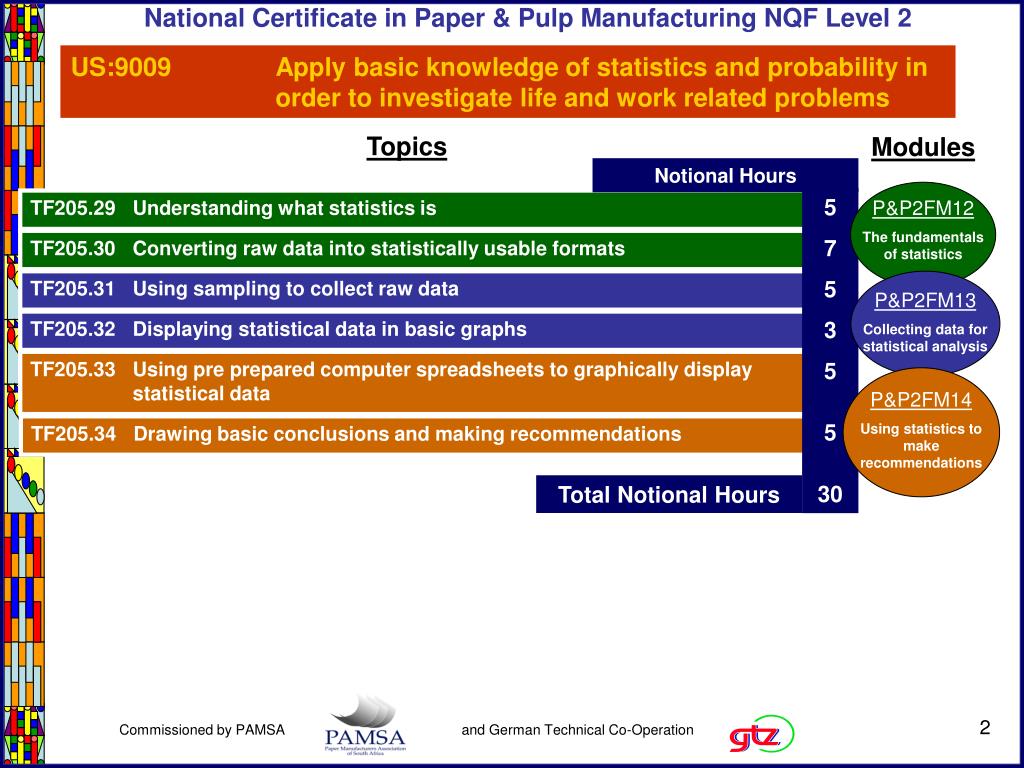 P&P2FM12 The fundamentals of statistics P&P2FM14 Using statistics to make recommendations P&P2FM13 Collecting data for statistical analysis US:9009 Apply basic knowledge of statistics and probability in order to investigate life and work related problems Topics Modules Notional Hours 5 7 5 3 5 5 30 TF205.29 Understanding what statistics is TF205.30 Converting raw data into statistically usable formats TF205.31 Using sampling to collect raw data TF205.32 Displaying statistical data in basic graphs TF205.33 Using pre prepared computer spreadsheets to graphically display statistical data TF205.34 Drawing basic conclusions and making recommendations Total Notional Hours