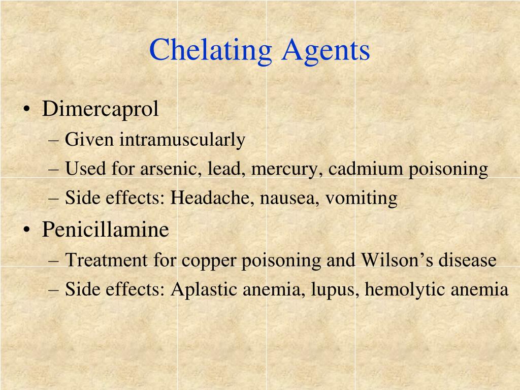 Chelating Agents • Dimercaprol • Given intramuscularly • Used for arsenic, lead, mercury, cadmium poisoning • Side effects: Headache, nausea, vomiting • Penicillamine • Treatment for copper poisoning and Wilson’s disease • Side effects: Aplastic anemia, lupus, hemolytic anemia