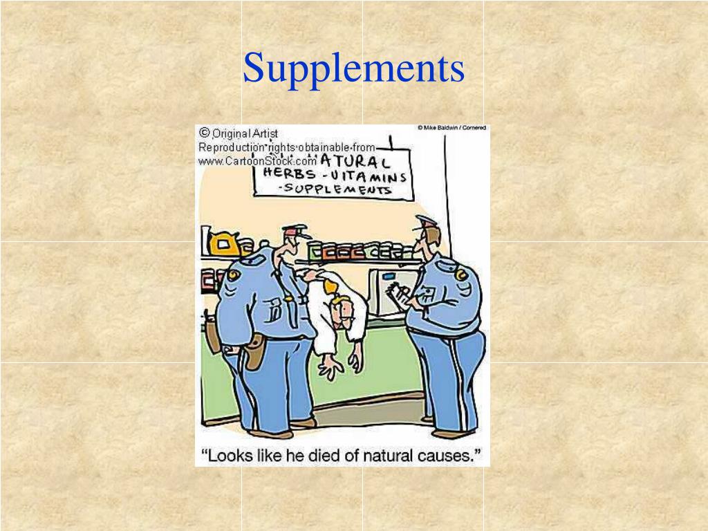 Health and Education Act of 1994 • Defined a dietary supplement as: • A product (other than tobacco) that is intended to supplement the diet • Is intended for ingestion in pill, capsule, tablet, or liquid form • Is not represented for use as a conventional food • Is labelled as a “dietary supplement” • Nutritional support statements do not have to be approved by the FDA • This law has made it very difficult for the FDA to ban dangerous dietary supplements.