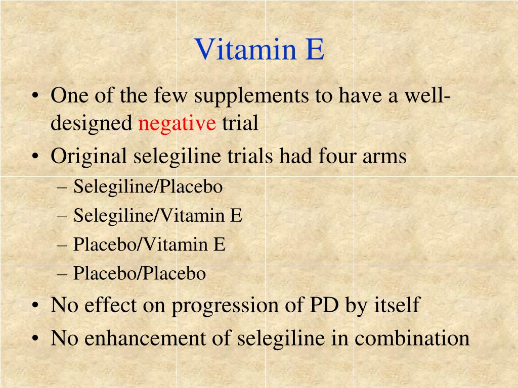 Vitamin E • One of the few supplements to have a well-designed negative trial • Original selegiline trials had four arms • Selegiline/Placebo • Selegiline/Vitamin E • Placebo/Vitamin E • Placebo/Placebo • No effect on progression of PD by itself • No enhancement of selegiline in combination