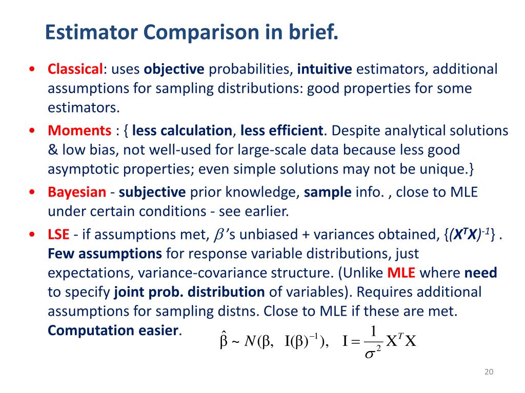 Estimator Comparison in brief. • Classical: uses objective probabilities, intuitive estimators, additional assumptions for sampling distributions: good properties for some estimators. • Moments : { less calculation, less efficient. Despite analytical solutions & low bias, not well-used for large-scale data because less good asymptotic properties; even simple solutions may not be unique.} • Bayesian - subjective prior knowledge, sample info. , close to MLE under certain conditions - see earlier. • LSE- if assumptions met, ’s unbiased + variances obtained, {(XTX)-1} . Few assumptions for response variable distributions, just expectations, variance-covariance structure. (Unlike MLE where need to specify joint prob. distribution of variables). Requires additional assumptions for sampling distns. Close to MLE if these are met. Computation easier.