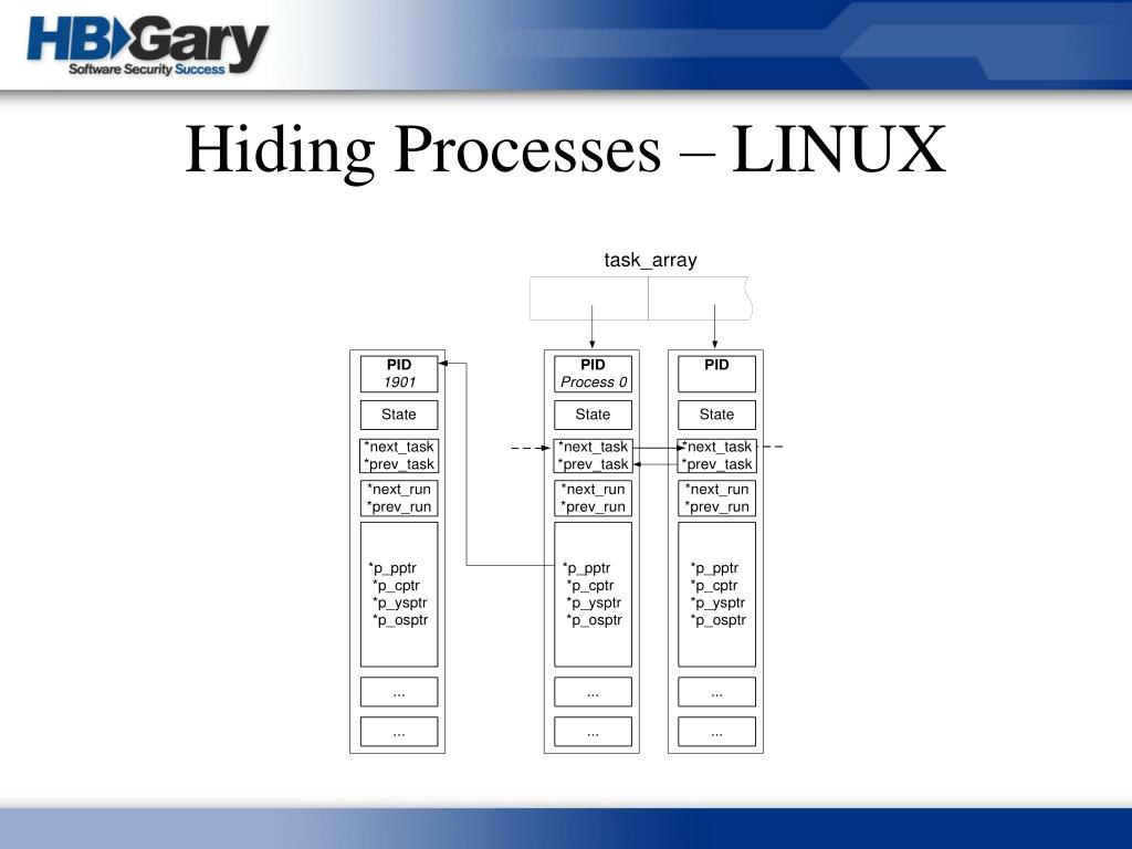 Hiding Processes – LINUX • The LINUX kernel contains an array of task_struct’s. • A task_struct is similar to an EPROCESS block in Windows • task_struct contains pointers to the prev_task and next_task • task_struct also contains pointers to the prev_run and next_run for the running processes