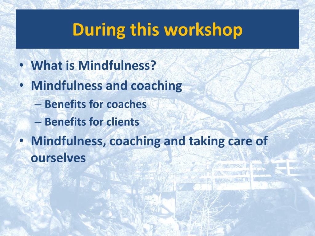 During this workshop • What is Mindfulness? • Mindfulness and coaching • Benefits for coaches • Benefits for clients • Mindfulness, coaching and taking care of ourselves