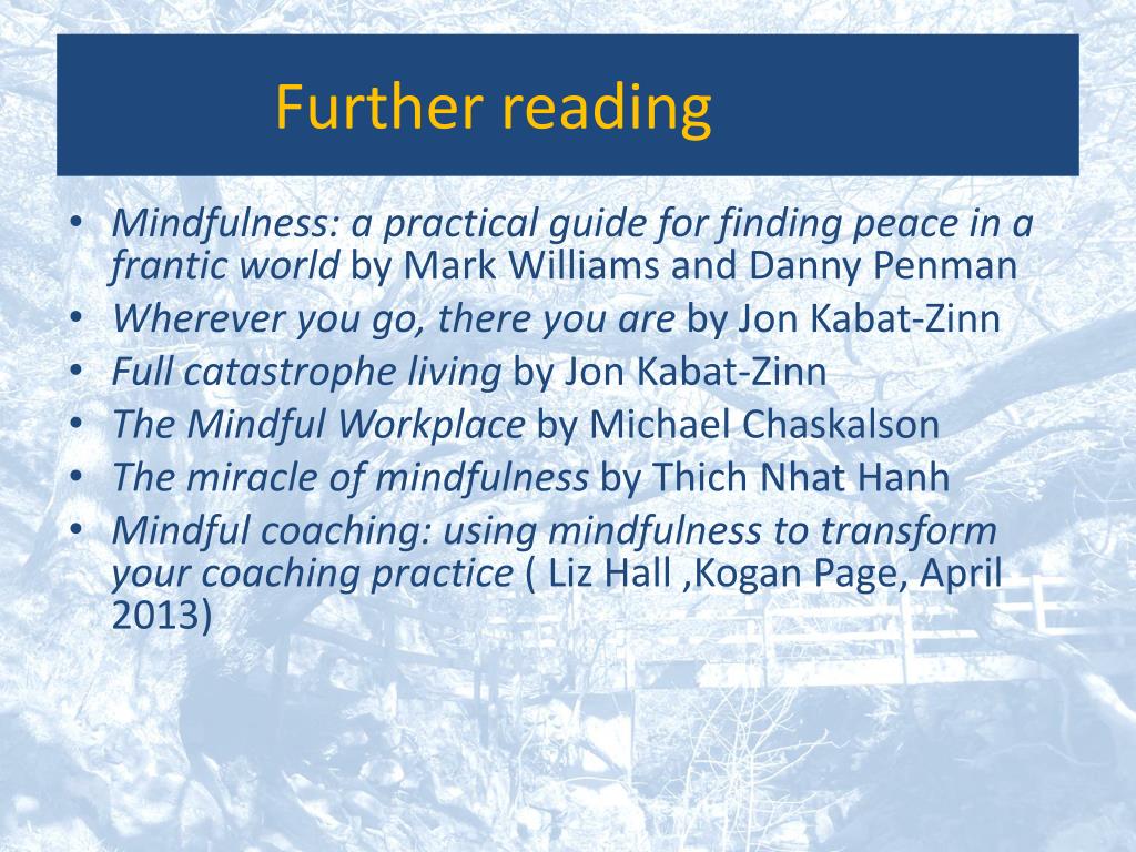 Further reading • Mindfulness: a practical guide for finding peace in a frantic world by Mark Williams and Danny Penman • Wherever you go, there you are by Jon Kabat-Zinn • Full catastrophe living by Jon Kabat-Zinn • The Mindful Workplace by Michael Chaskalson • The miracle of mindfulness by Thich Nhat Hanh • Mindful coaching: using mindfulness to transform your coaching practice ( Liz Hall ,Kogan Page, April 2013)