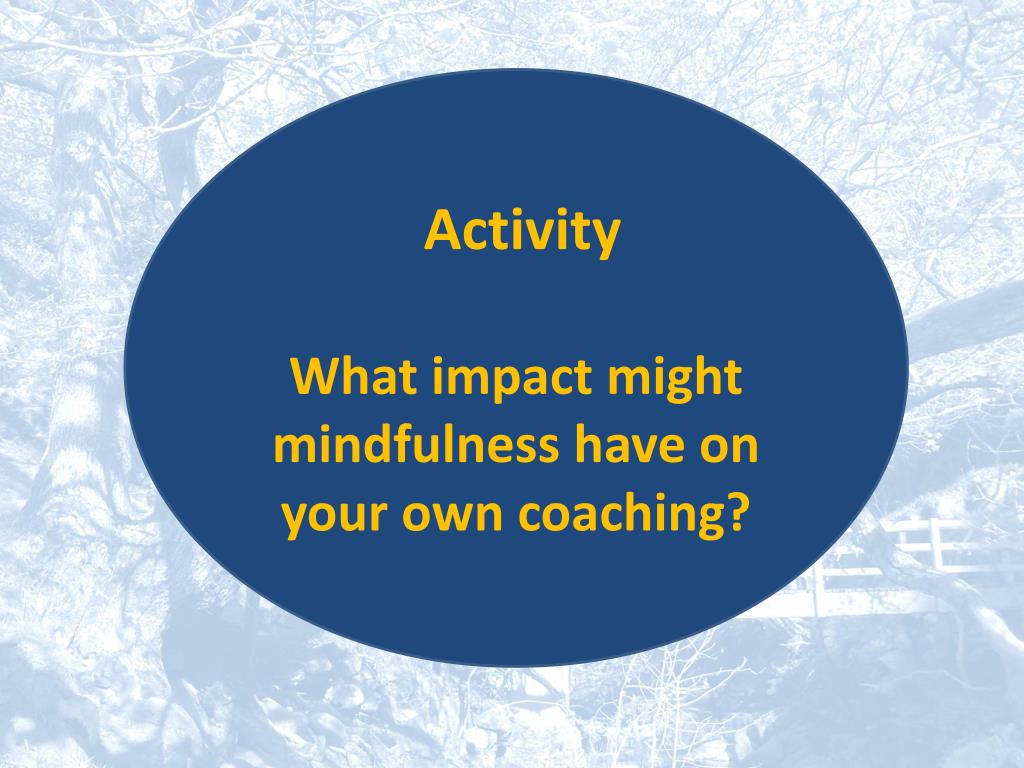 Some reasons why they don’t • No concerns 76% • Client will think I’m ‘woolly/fluffy/unprofessional.' 18% • ‘Encouraging clients to practice mindfulness might expose them to unpleasant feelings, buried experiences that will be difficult to deal with in the coaching.’ 7% Source: Mindfulness in Coaching survey (Hall, 2012)