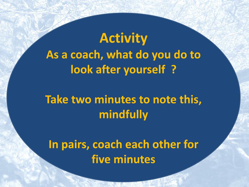 Activity As a coach, what do you do to look after yourself ? Take two minutes to note this, mindfully In pairs, coach each other for five minutes