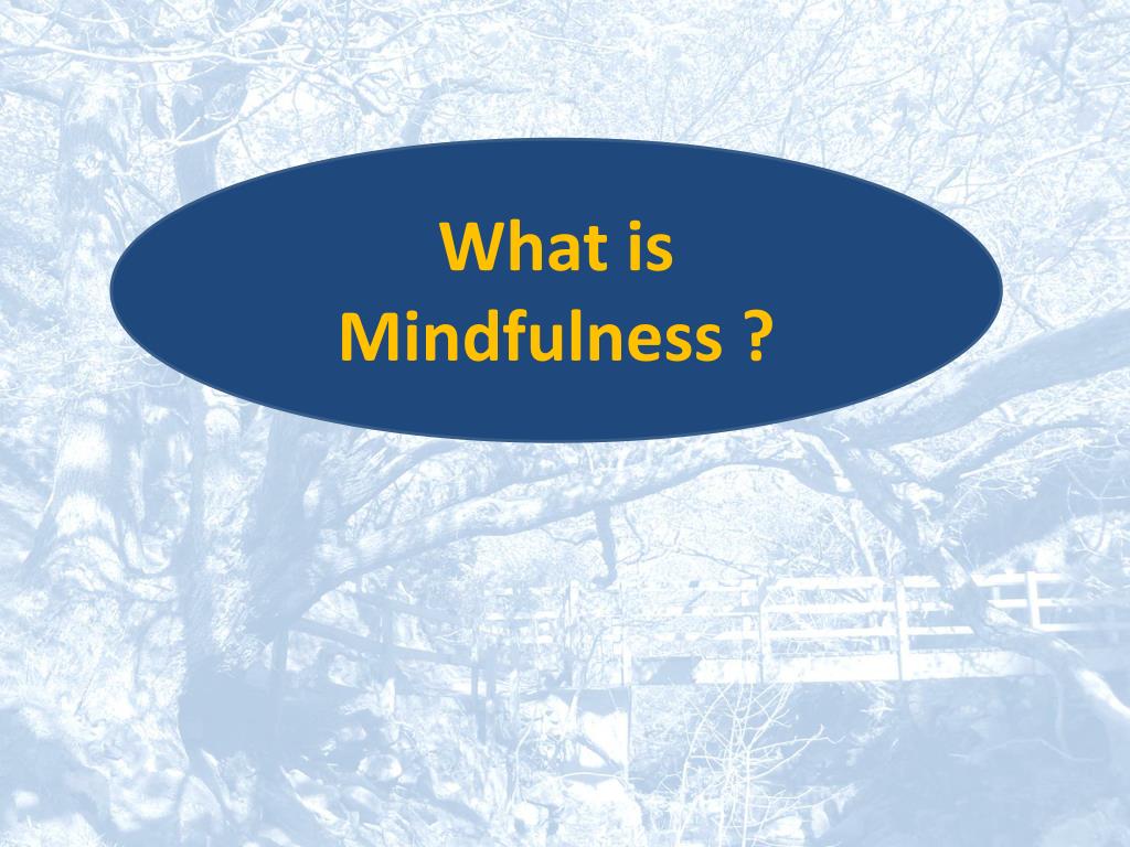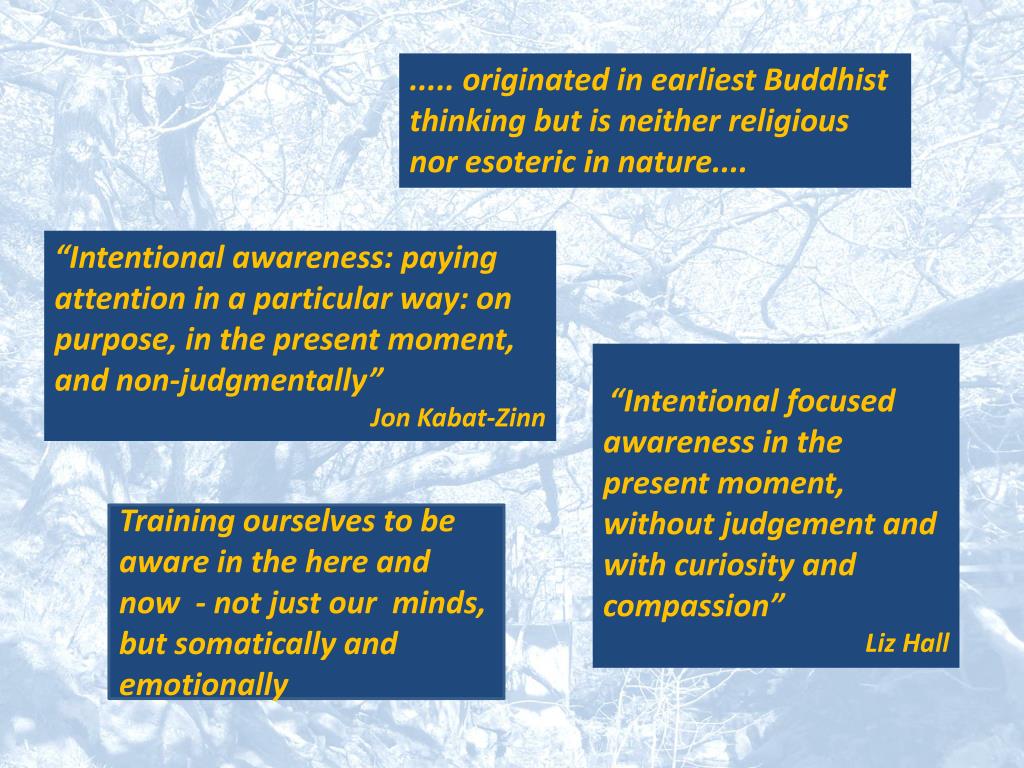 ..... originated in earliest Buddhist thinking but is neither religious nor esoteric in nature.... “Intentional awareness: paying attention in a particular way: on purpose, in the present moment, and non-judgmentally” Jon Kabat-Zinn “Intentional focused awareness in the present moment, without judgement and with curiosity and compassion” Liz Hall Training ourselves to be aware in the here and now - not just our minds, but somatically and emotionally
