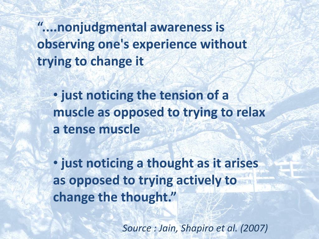 “....nonjudgmental awareness is observing one's experience without trying to change it • just noticing the tension of a muscle as opposed to trying to relax a tense muscle • just noticing a thought as it arises as opposed to trying actively to change the thought.” Source : Jain, Shapiro et al. (2007)